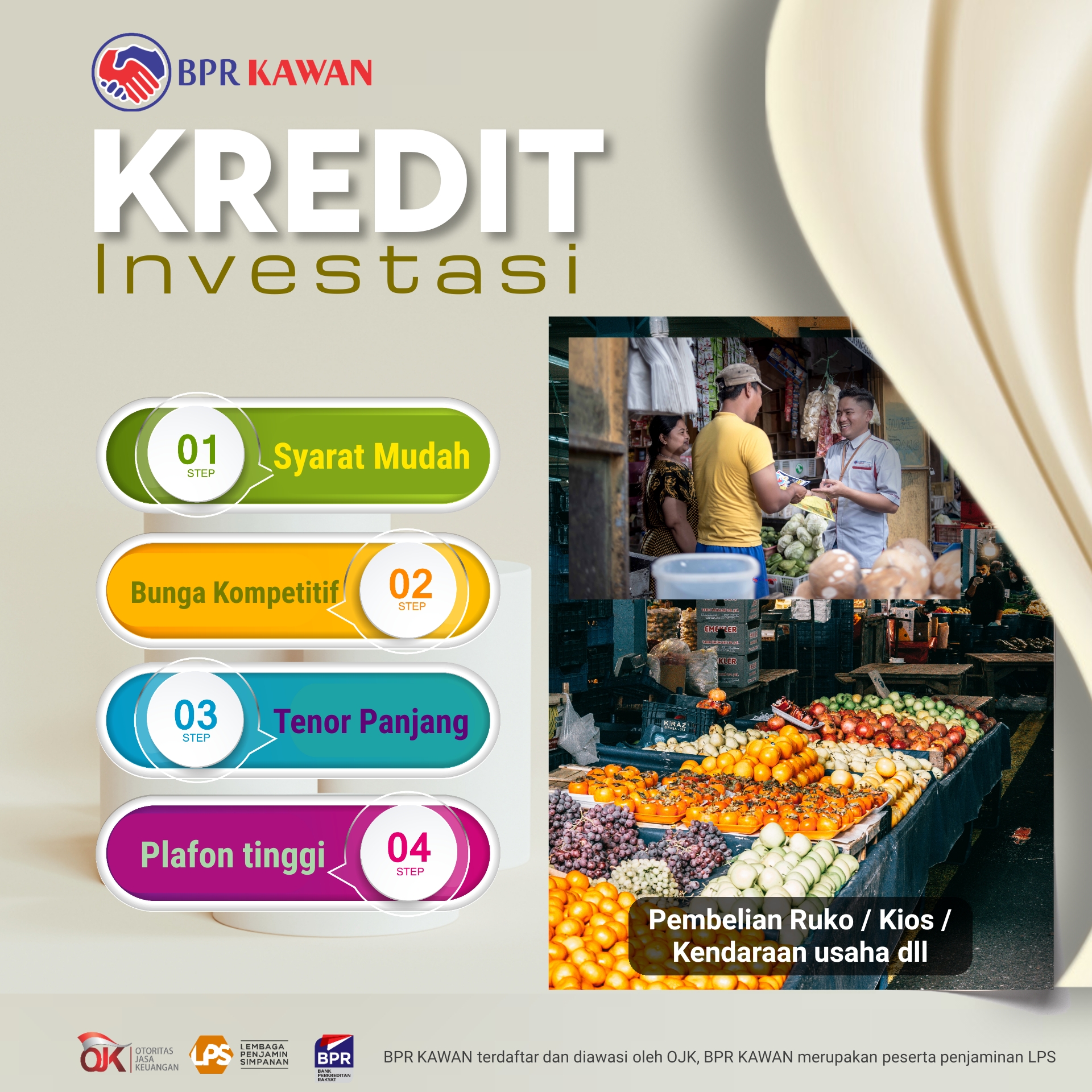 Kredit Investasi Adalah fasilitas kredit yang diberikan untuk membiayai kebutuhan barang modal dalam rangka rehabilitasi, modernisasi, perluasan, pendirian proyek baru dan atau kebutuhan khusus terkait investasi.